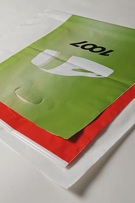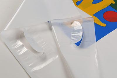 Ausgestanztes Griffloch: Je nach Einsatzzweck kann die Tragetasche mit ausgestanztem Griffloch, mit stabilen Kunststoffgriffen, auch mit Regenklappe oder als Matchsack mit Tragekordel gefertigt werden.